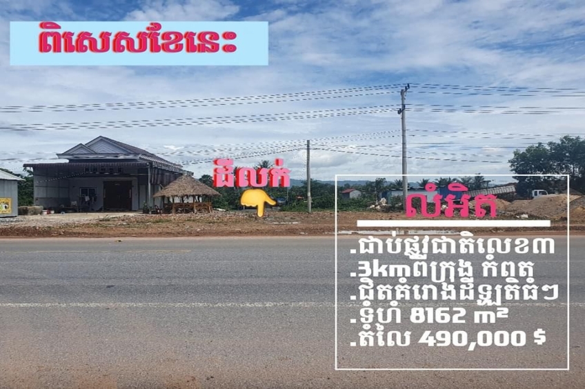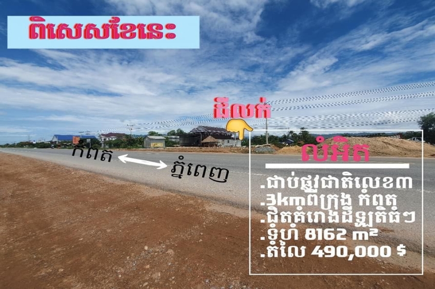ដីជាប់ផ្លូវជាតិ តែ3km ពីក្រុងកំពត ទំហំ៨១៦២ម២ លក់បន្ទាន់ធូរបំផុត