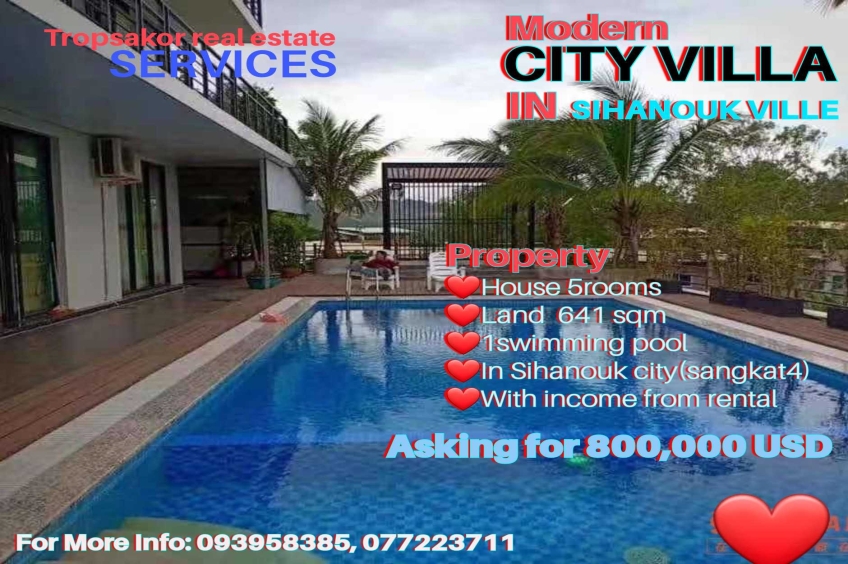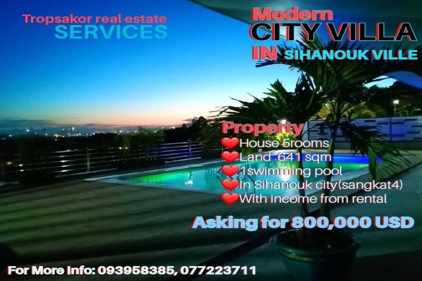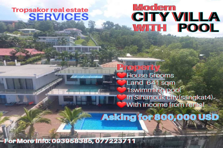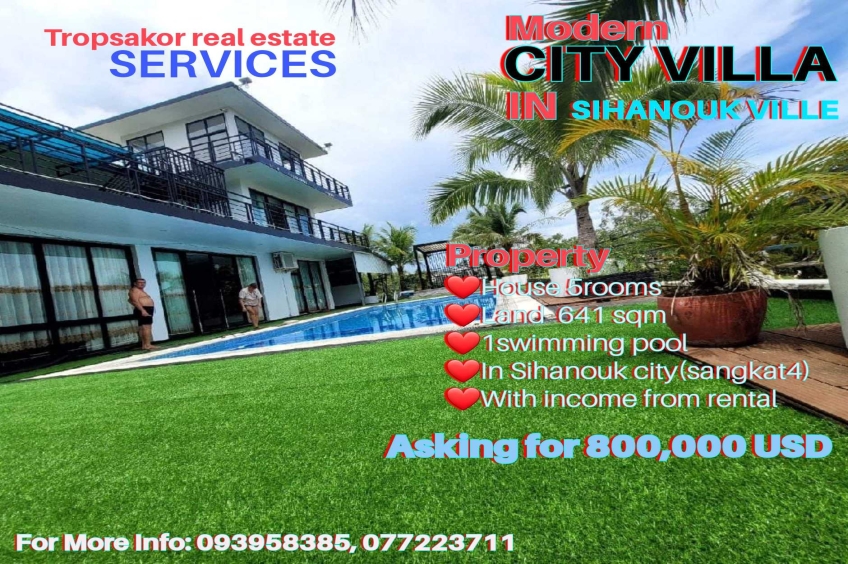 ជួបទ្រព្យពិតហើយ ក្រុងកំពង់សោម! ទិញរួចបានចំនូលពីការជួលស្រាប់ 4,500$/ខែ ផ្ទះស្អាត វីឡាទាន់សមយ័និងអាងហែលទឹកទៀតផង 5បន្ទប់កេង ប្លង់រឹង 641 ម2 ***តំលៃ 800,000$ (អាចចរចារបាន) តំណភ្ជាប់ទៅការចរចារ : 093958385, 077223711